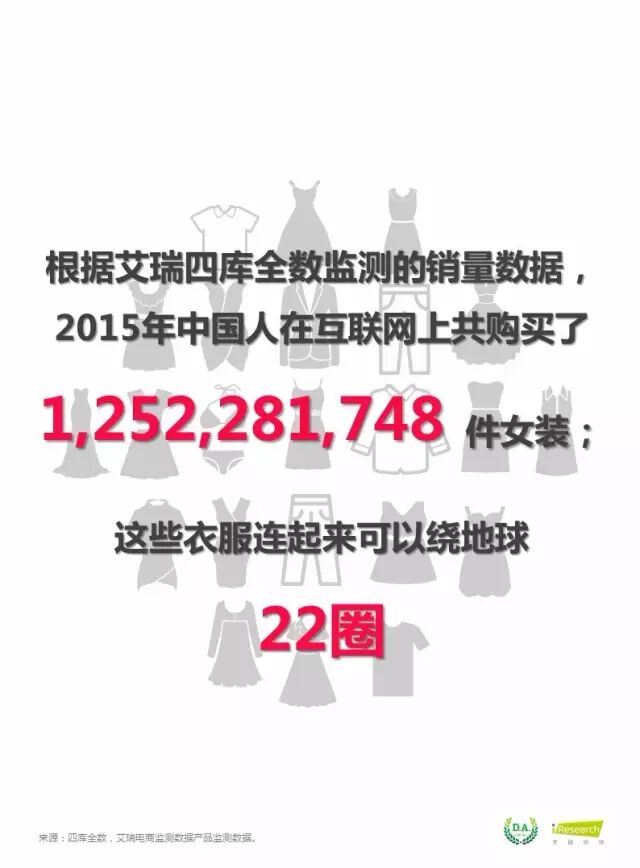 【数据猿导读】 据艾瑞四库全数监测,2015年中国人在互联网上共购买了1,252,281,748件女装,这些衣服连起来可以绕地球22圈