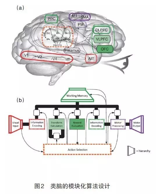 如果这样来看脑科学与类脑算法研究的关系,我们可能会发现很多可供借鉴的基本规律。下面简单分析几个例子。第一是我们可以向脑学习如何更好地实现算法设计的模块化。模块化设计早已被计算机科学所采用。在这样的设计中,问题的解决分成几个固定的部分(子问题),每一个计算模块(子程序)只负责处理其中的一个。这一设计的优势在于能使算法设计大大简化,易于调试,易于修改,可以逐步完善并增加功能。更重要的是,因为表面上看起来不一样的问题往往能分解成相似的子问题,这使得模块可以重复利用,大大提高了效率并使得高度简并的系统能够胜任复杂多样的任务[7]。模块化设计的优势显而易见,但面对一系列具体问题,应该如何最有效率地划分子问题,这本身是一个困难的任务。而这可能是我们能够向大脑学习的重要知识之一。真实的大脑是模块化设计的一个范例,每个脑区或亚区负责一个信息处理的环节或方面,而具体的模块划分是经过漫长自然选择加以优化的结果,已经适应了高效处理真实世界的实际问题。深度神经网络借鉴的对于视觉信息的多层、分步处理结构,某种意义上就是大脑模块化设计的一个方面。另外近期的一项研究显示,仅仅初步借鉴了非常粗略的脑功能模块划分(包括一系列视觉区域,一个记忆区域,一个决策区域以及一系列运动控制区域等),就能使得一个相对简单的系统胜任多种不同的任务(图2)[8]。